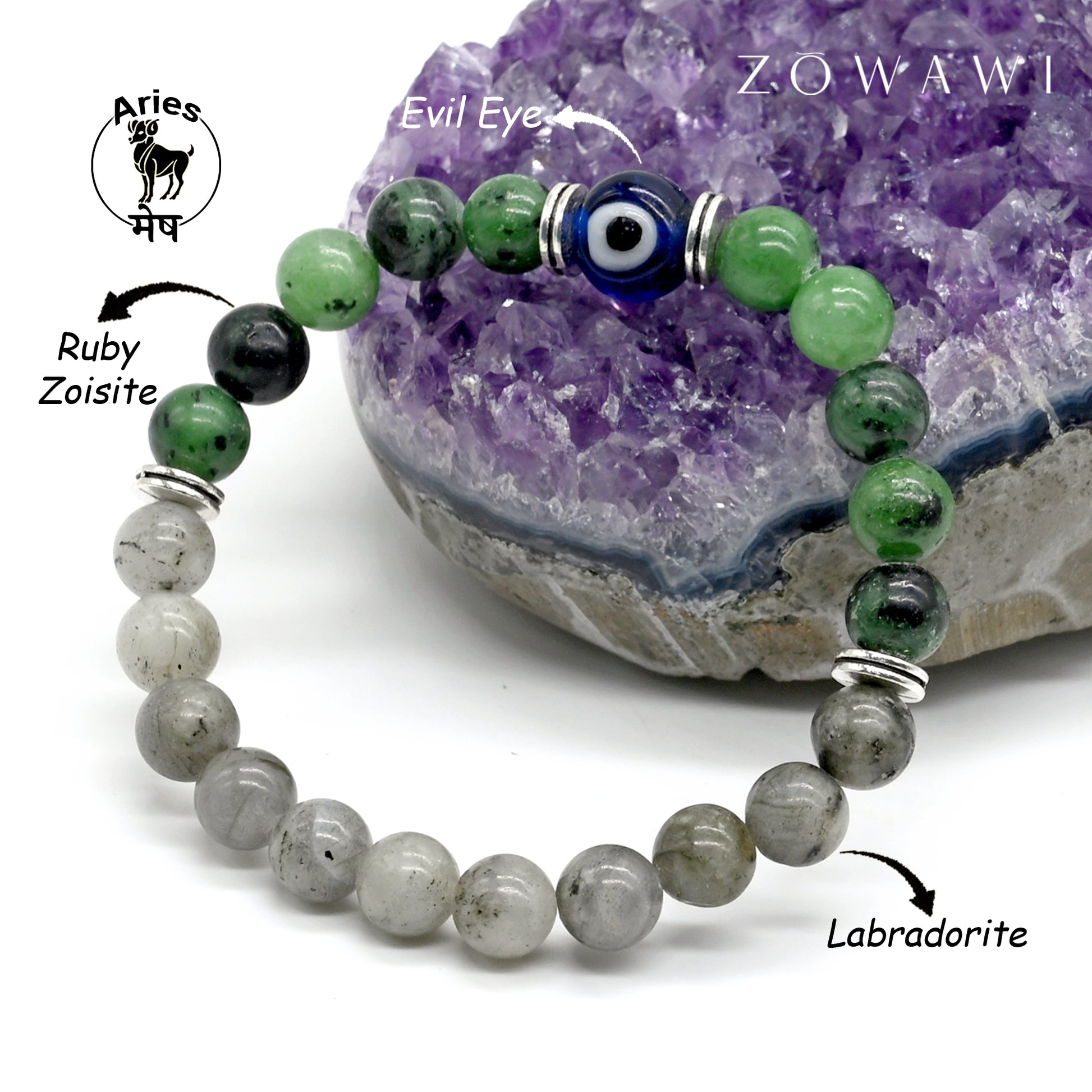 In short, the combination of Ruby Zoisite, the Evil Eye, and Labradorite can enhance an Aries' innate traits like courage, leadership, and vitality, while also providing emotional protection, spiritual insight, and grounding energy.